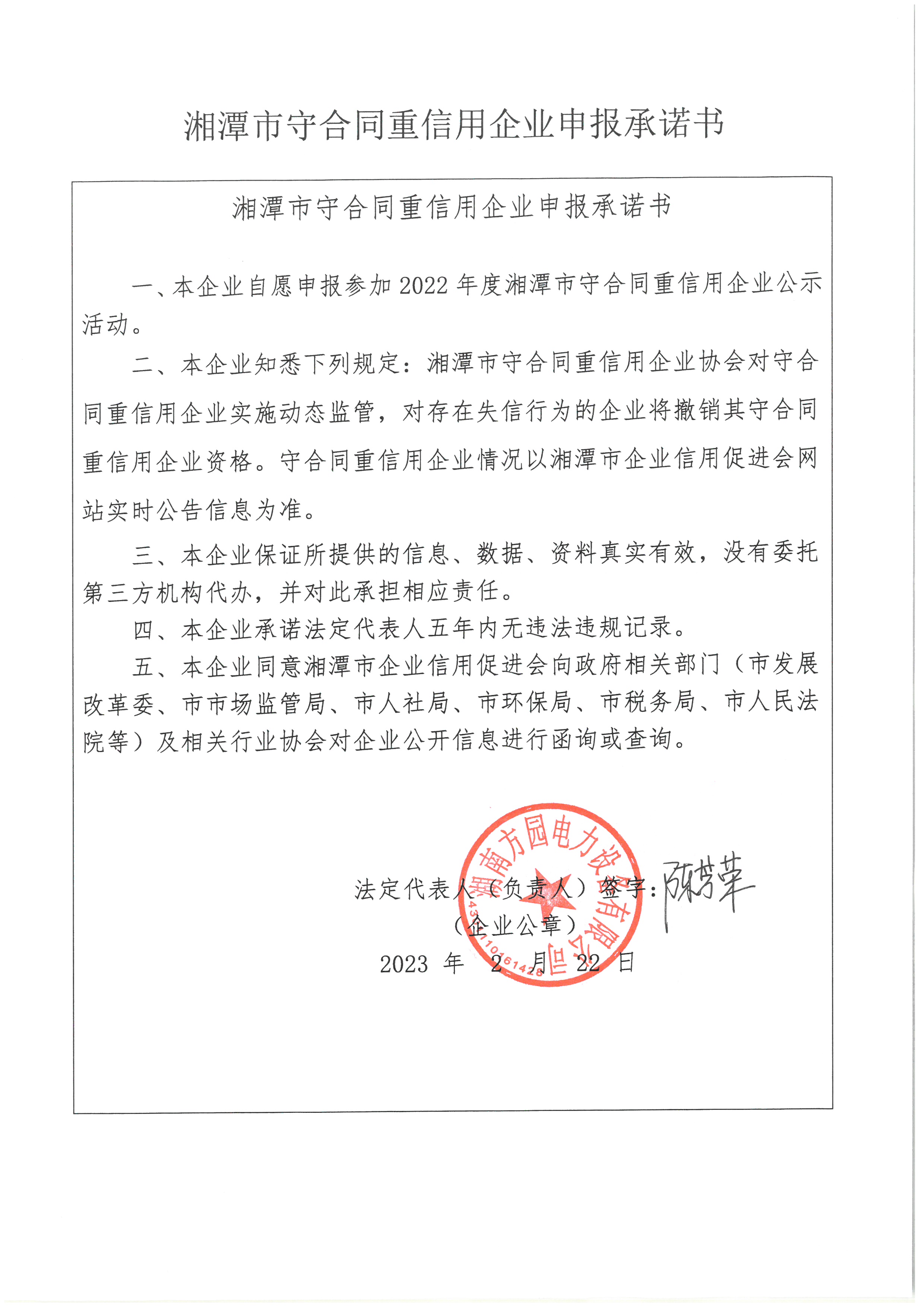 本企業(yè)根據(jù)《湘潭市守合同重信用企業(yè)申報規(guī)定》等編制 2022 年度企業(yè)信用報告書,并保證本報告書內容真實、準確、完整。