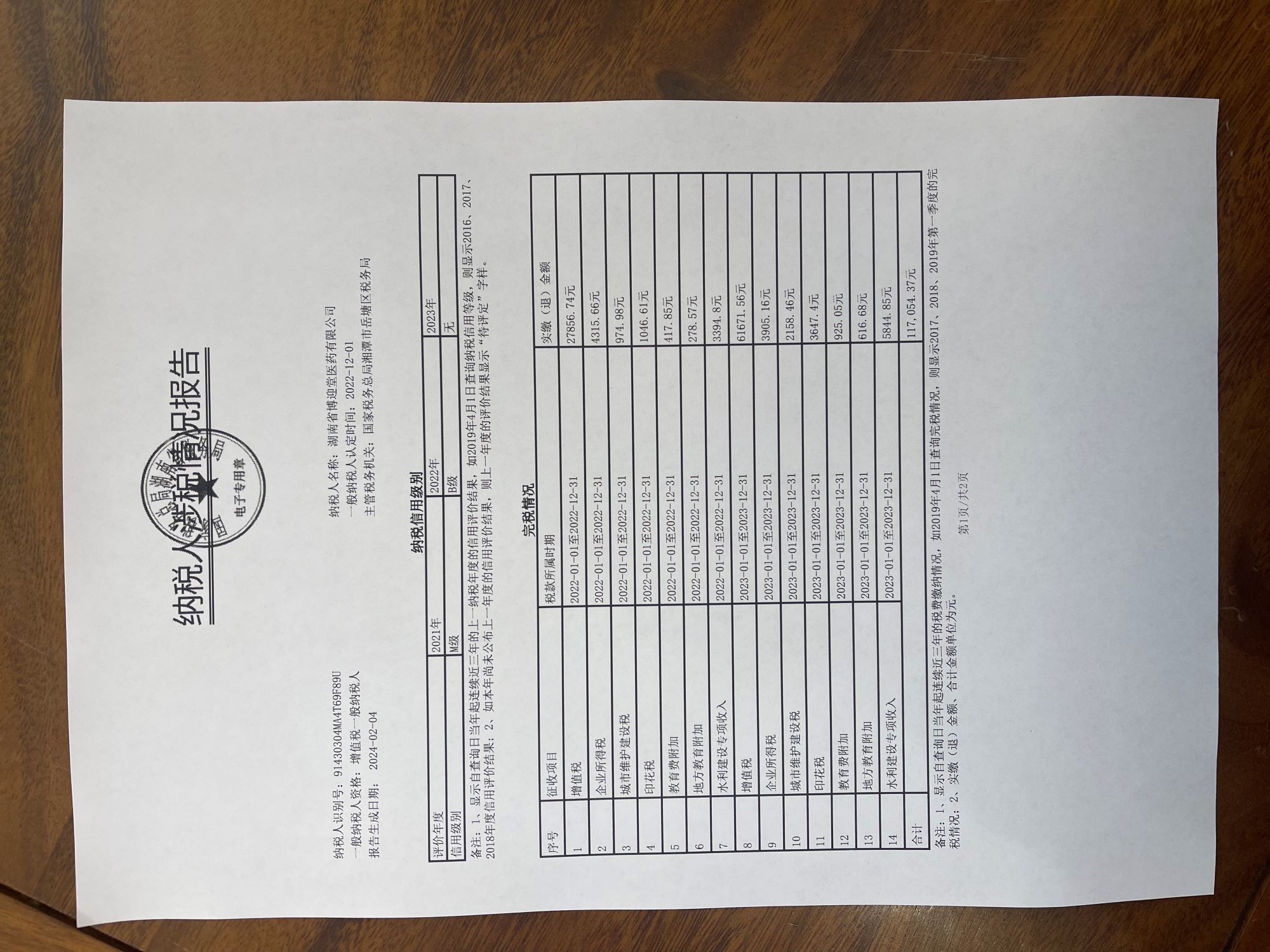 企業(yè)納稅信用等級報告: