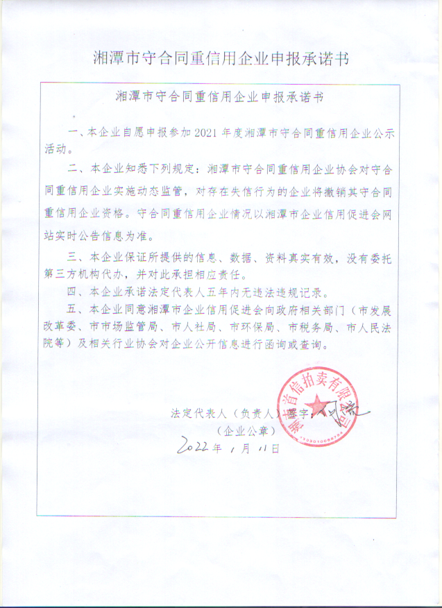 本企業(yè)根據(jù)《湘潭市守合同重信用企業(yè)申報(bào)規(guī)定》等編制 2021 年度企業(yè)信用報(bào)告書,并保證本報(bào)告書內(nèi)容真實(shí)、準(zhǔn)確、完整。