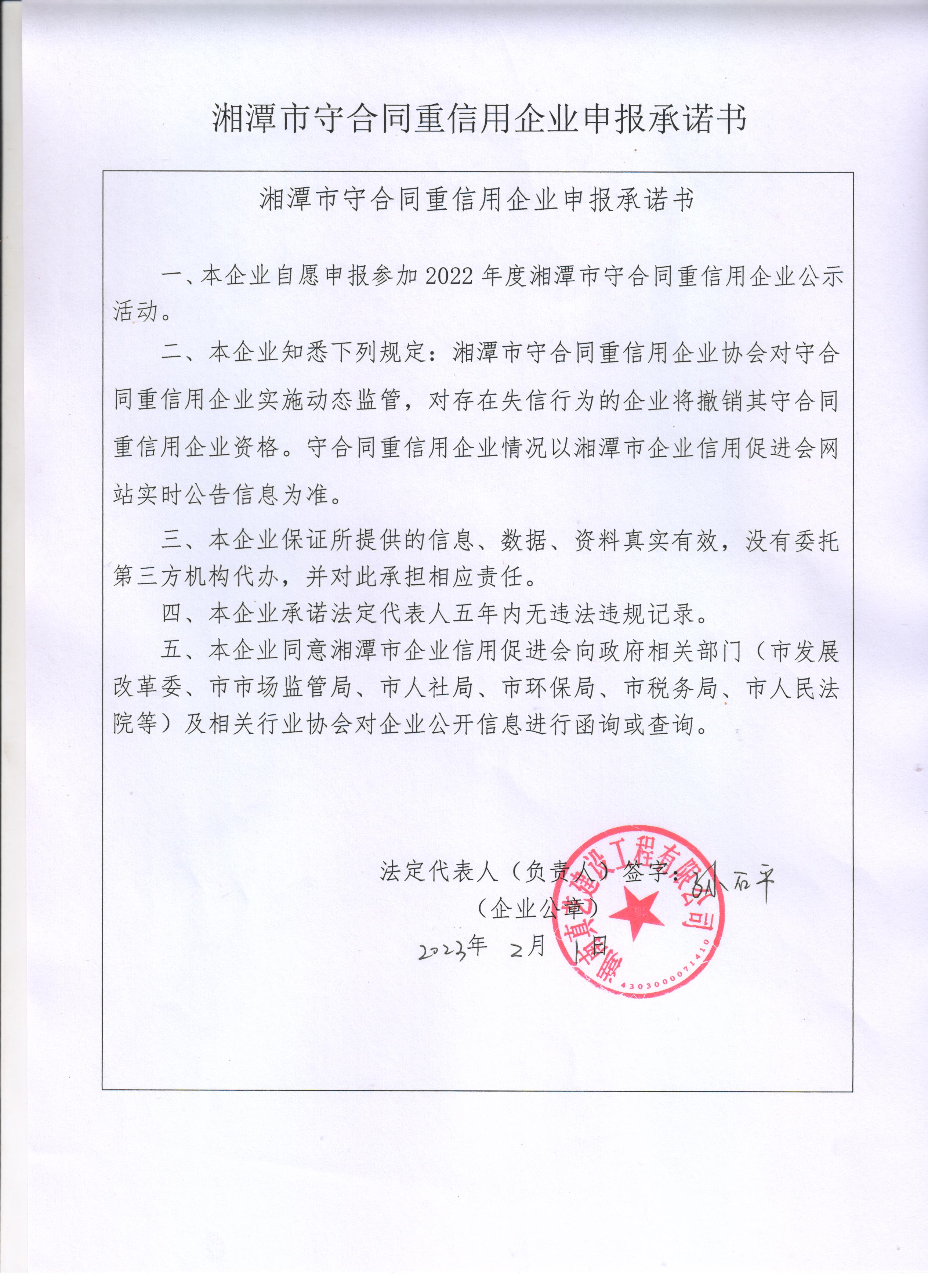 本企業(yè)根據(jù)《湘潭市守合同重信用企業(yè)申報規(guī)定》等編制 2022 年度企業(yè)信用報告書,并保證本報告書內(nèi)容真實(shí)、準(zhǔn)確、完整。