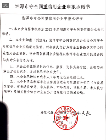 本企業(yè)根據(jù)《湘潭市守合同重信用企業(yè)申報規(guī)定》等編制 2023 年度企業(yè)信用報告書,并保證本報告書內(nèi)容真實、準(zhǔn)確、完整。