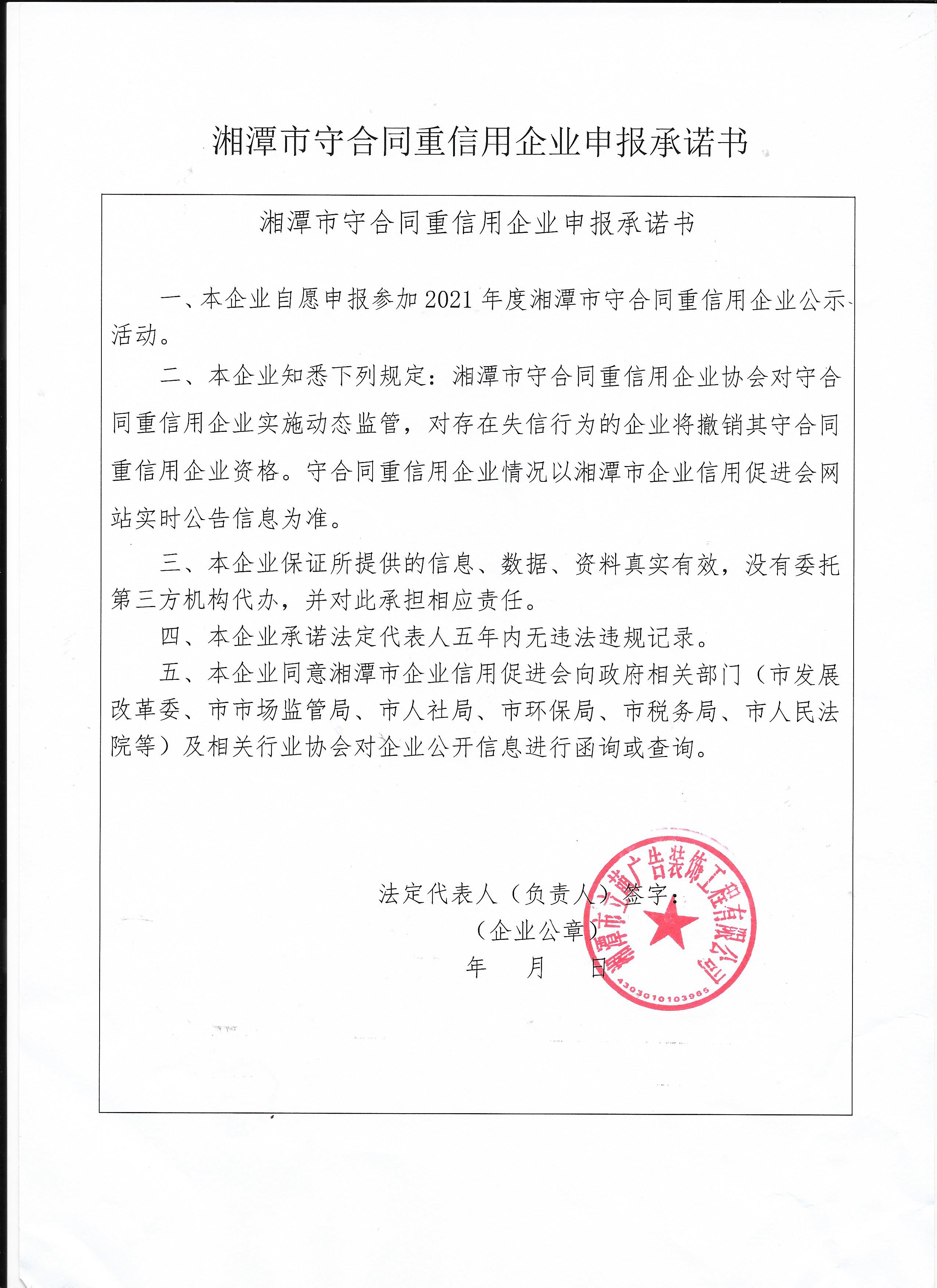本企業(yè)根據(jù)《湘潭市守合同重信用企業(yè)申報規(guī)定》等編制 2021 年度企業(yè)信用報告書,并保證本報告書內(nèi)容真實、準(zhǔn)確、完整。