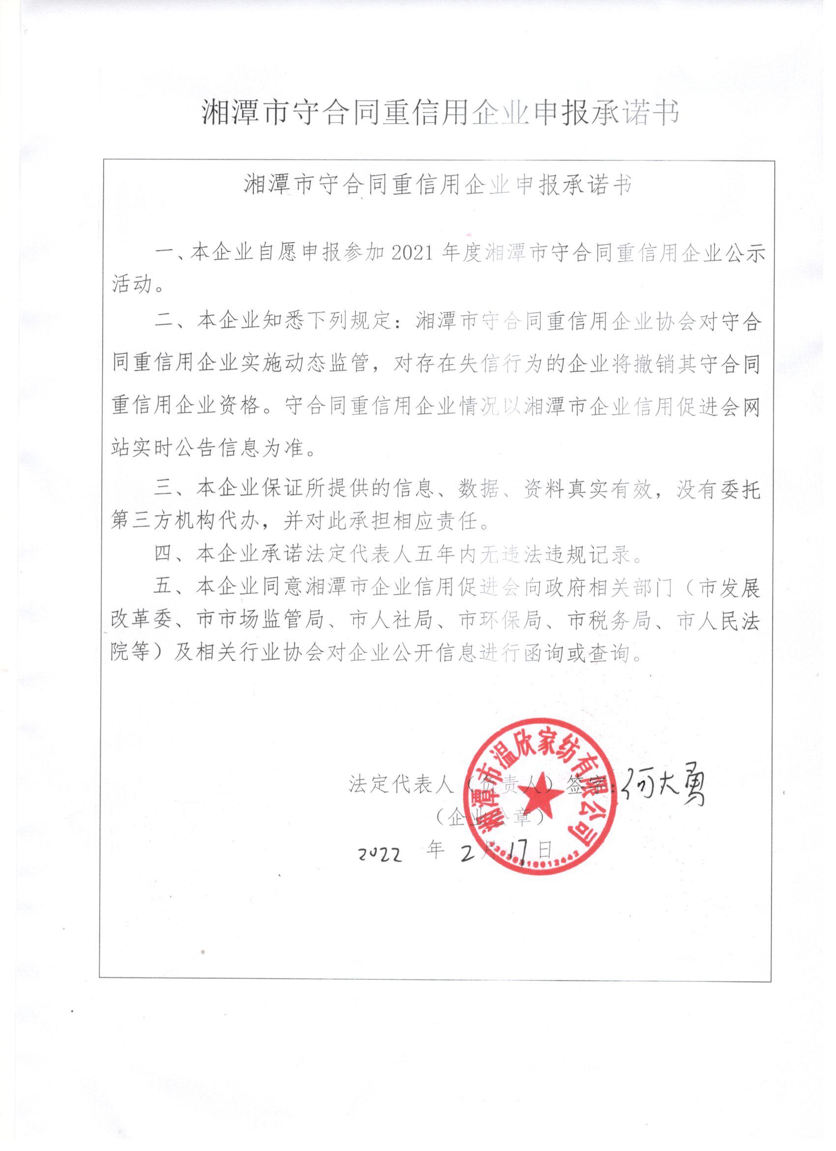 本企業(yè)根據(jù)《湘潭市守合同重信用企業(yè)申報規(guī)定》等編制 2021 年度企業(yè)信用報告書,并保證本報告書內容真實、準確、完整。